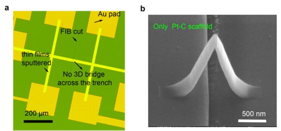 We then check that the resistivity of the 3D scaffold is much higher than the magnetic thin films. Another device is fabricated using the same process, but without sputtering the thin film (skip steps 5 and 6) so that we can measure the resistance of the Pt-C bridge scaffold (Figure 4b).The resistance of the Pt-C scaffold is 3 G which is also significantly larger than resistance measured across the bridge with magnetic thin film on top (five orders of magnitude higher). The corresponding resistivity of the scaffold is 1.5 × 10cm, which is in the range of reported values (10 to 10cm) for Pt-C structures grown using (CH)Pt(CCH) precursor [35]. More details about the electrical verification tests on these two test devices can be found in Appendix B.