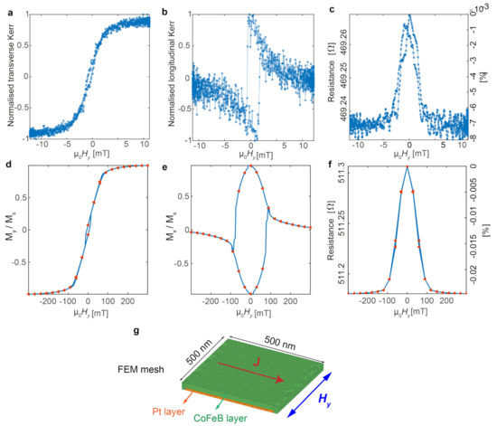 2D track section: MOKE and magnetotransport results and simulations for applied perpendicular to the long axis. (a) Normalised transverse Kerr (proportional to ). Error = (b) Normalised longitudinal Kerr (proportional to ). Error = (c) Magnetoresistance measured across the 2D track section (V2–V1). Error = m (d,e) / and / results from Mumax3 simulation. (f) The simulated MT result based on the combination of Mumax3 and FEM simulation. (g) The FEM mesh used for the 2D track section.