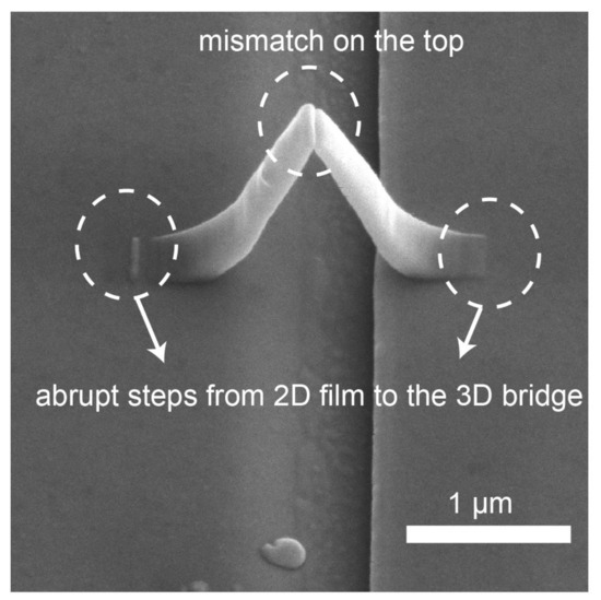 We note that the measured resistance is about 28 k and the expected resistance of these sputtered materials is around 1 k. The measured resistance is significantly larger which is likely to be due to imperfections from the Pt-C scaffold where a mismatch in the top region of the bridge is observed. In additional to the mismatch, there are sudden changes in surface height at the transition region between the 2D film and 3D bridge as shown in Figure 8. These abrupt steps lead to non-uniform step coverage and likely result in defects [44] in the sputtered thin films and hence a large contact resistance [45]. We included a constant contact resistance of 27 k in the FEM model to compensate this discrepancy in the measured and simulated resistance. The maximum percentage change due to AMR from the simulation is 2.5 × 10 and is 1 × 10 from the experiment. The percentage change simulated is the same order of magnitude with the experiment, which indicates that this unexpected large resistance is not from a magnetic source, and also that the 2D micromagnetic model is adequate to capture the essence of the switching process.