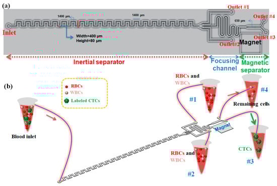 Circulating tumor cells (CTCs) captured from blood samples have great potential for the diagnosis and treatment of cancer. Microfluidics has emerged as a great technology for cell separation application by exploiting different properties of cells and different physical principles [1,2]. These techniques are categorized as microfluidic microfilters, deterministic lateral displacement, hydrodynamic filtration, inertial methods as well as methods based on external force fields such as dielectrophoretic (DEP), acoustic, magnetic, and optical separation methods [3,4]. Additionally, these methods can be categorized into two groups of label-free and affinity-based/labelled approaches. Label-free cell separation methods function based on the inherent cell properties (e.g., density, size, shape, deformability, electrical properties, magnetic susceptibility, compressibility, refraction index) while affinity-based cell separation approaches use “labels” (e.g., particle-antibody conjugates to a membrane protein specifically) to capture target cells [5]. Among the abovementioned microfluidic methods for cell separation, inertial methods from passive methods and magnetic methods from active methods offer great potential for different target cell separation. Moreover, these methods offer merits of efficiency, biocompatibility, and simple configurations [6].