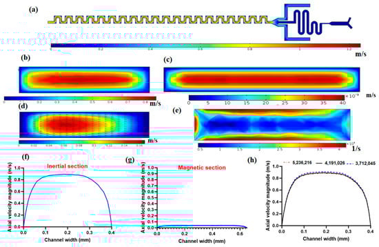 Fluid flow simulation was performed to solve the governing equations by considering the inlet and outlet boundary conditions and wall boundaries. Figure 2a shows the velocity field in the mid-plane of the channel. As it is demonstrated in this figure, near the walls due to no-slip conditions on walls, there is zero velocity and at the middle of the channel, there is the maximum velocity because of the parabolic velocity distribution within the channel in laminar flow. Figure 2b shows the axial velocity magnitude in the cross-section of the channel. As it is shown in this figure, the maximum velocity occurs in the central region of the cross-section, and the minimum velocity occurs near the walls due to the no-slip condition on the walls. As mentioned in the above section, the magnetic separator has a larger channel width (650 µm) to reduce the velocity of flow so as to have effective magnetic force on nanoparticle conjugated CTCs in the presence of the magnetic field. Figure 2c shows the velocity distribution in the magnetic cell separator cross-section, which shows the lower values of velocity in the magnetic section compared to the inertial separator. Another important aspect of the proposed channel for inertial cell separation is the formation of secondary flow within the cross-section of the channel, as shown in Figure 2d. This secondary flow plays a vital role in helping lateral migration of particles/cells, which in its competition with inertial lift force leads to distinct equilibrium positions for particles based on their size. Figure 2e shows the shear rate in the cross-section of the inertial channel, as shown in this figure, the shear rate is at its maximum near the walls and minimum far away from walls. The shear rate plays a crucial role in inertial lift force for the separation of cells. In Figure 2f,g, the axial velocity profiles for inertial separator and magnetic cell separator are plotted, respectively. These velocity profiles are along a mid-line in the direction of the width of the channel in a cross-section of the channel. As shown in Figure 2f,g, the magnetic cell separation section has significantly lower values of velocity compared to the inertial section, which is important for effective magnetic force on target cells that are labeled with magnetic nanoparticles. Moreover, we performed mesh independency analysis with different numbers of elements for velocity profiles for axial velocity, as shown in Figure 2h, and after choosing 4,191,026 meshes with a minimum size of 1.6 µm and maximum size of 6.1 µm, we can see that the velocity profile is independent of the number of elements for the computational domain.