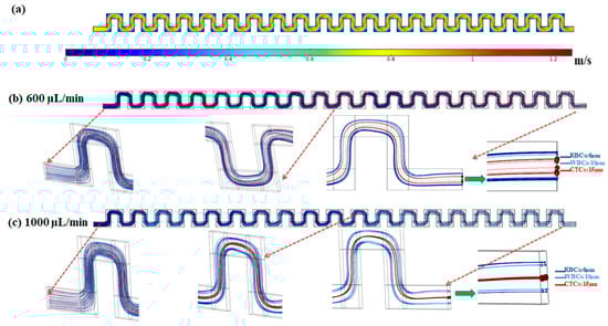 (a) Velocity distribution in the mid-plane of the inertial section of the channel at 1000 µL/min. (b,c) Particle trajectories at flow rates of 600 and 1000 µL/min in the inertial section of the proposed hybrid device.