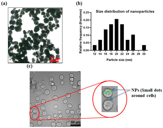 Figure 4a shows the transmission electron microscopy (TEM) image of produced nanoparticles. Figure 4b shows the size distribution of the produced nanoparticles which the size of the nanoparticles was analyzed using ImageJ software and sizes in the range of 10–30 nm. By the addition of specific interfering reagents, these nanoparticles can be conjugated with the Ep-CAM antibodies and later they can specifically attach to the antigens on MCF-7 cells. Arginine, as an α-amino acid containing two carboxyl and amine groups, can confine magnetite nanoparticles via a shell-core binding and the carboxyl groups are placed outwards and can be attached to the amine group of the antibodies. N-Hydroxysuccinimide (NHS) and 1-Ethyl-3-dimethylaminopropyl (EDC) were employed to activate the functional groups and make the conjugation of the nanoparticle–antibody. After preparing the antibody-conjugated nanoparticles in PBS buffer, 100 µL of this solution were mixed with 1 M MCF-7 cells in PBS and incubated for 1 h to enable the conjugation of the MCF-7 cells to nanoparticles. Figure 4c shows the binding of antibody-conjugated nanoparticles to the MCF-7 cells. As shown in Figure 4c, CTC membranes are surrounded by magnetite nanoparticles to increase the magnetic susceptibility of the cells in the presence of the magnetic field.