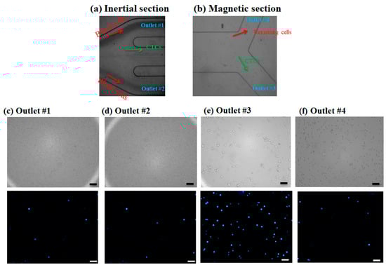 (a,b) Microscopic images for cell suspension flow at the outlet of inertial and magnetic separation, respectively. (c–f) Brightfield image and DAPI stained image for MCF-7 cells in different collecting outlets in inertial and magnetic separator. Scale bares are 100 µm.