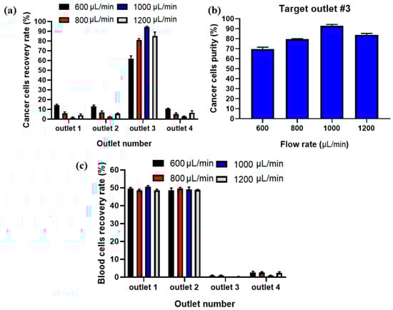 The recovery rate/separation efficiency and purity for separated MCF7 cells as well as blood cells for collecting outlets in different flow rates using Equations (8) and (9) were calculated. Figure 6a shows the comparison of the recovery rate of CTCs at different flow rates, and it displays that the proposed hybrid device can separate MCF-7 cells from diluted blood with separation efficiency of ~95% at flow rate of 1000 µL/min. Additionally, Figure 6b shows the purity of captured CTCs, which shows the maximaum purity of ~93% at 1000 µL/min for input sample. At higher flow rates the MCF-7 cells are focused in the middle of the channel in the asymmetric serpentine inertial separator and blood cells (RBCs and WBCs) are focused close to the sidewalls of the inertial separator (as shown in numerical simulation of particle’s movement in inertial section). Figure 6c shows the recovery rate for blood cells in different collecting outlets for different flow rates. Based on this results, the majority of blood cells (~100%) are depleted in the inertial section of the hybrid channel (outlets 1 and 2) before the entrance to the magnetic separator, which leads to higher separation efficiency and purity for CTCs in the magnetic separator as well as in the proposed hybrid device and minimum numbers of blood cells are entered into the target outlet (#3).
