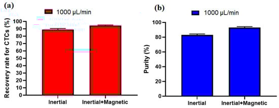 To investigate the effect of the inertial section for the proposed hybrid design, another experiment without labeling CTCs with nanoparticles and antibodies was performed at a flow rate of 1000 µL/min (optimal flow rate) and after analyzing the images for collected cells, the recovery rate of 89% and purity of 82% were achieved for inertial section. Figure 7a,b shows the comparison of the inertial and hybrid (inertial + magnetic) cell separation performance in terms of recovery rate and purity at flow rate of 1000 µL/mi. As shown in this figure, the main advantage of using magnetic labeling of CTCs is improving the purity of CTCs, which increased from 82% in the inertial section to 93% in the hybrid (inertial + magnetic) approach. Moreover, the recovery rate also improved about 6% in the hybrid approach compared to the single inertial approach.