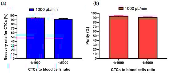 Comparsion of the (a) recovery rate and (b) purity of separated CTCs at two different ratios of CTC to blood cell numbers.