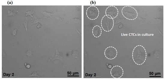 (a) Microscopic image for separated CTCs which were cultivated for 48 h. (b) Selected cells are live CTCs.