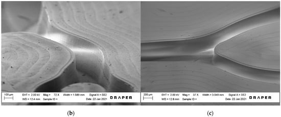 The distribution manifold carrying blood into and out of the parallel array of blood channels is designed to distribute blood evenly across each of the channels while avoiding sharp corners and sudden transitions at junctions and branch points and where the width or depth of the channels changes. As described in the Section 2.2 that follows, the master molding technology utilizes precision machining techniques that enable the depth and width of features to vary smoothly from one diameter to another, unlike conventional photolithographic means for producing masters for microfluidic molding. This design enables the blood distribution manifolds to accommodate the higher flows necessary to carry blood to and from multiple transfer channels to be deeper than the corresponding transfer channel, thereby avoiding the need for excessively wide trunk regions in the network. A guiding principle for the design of these distribution networks is Murray’s Law [35], which is based upon observations regarding the morphometric features of physiologic circulation networks. Murray’s law states that at a bifurcation, the third power of the parent channel diameter is equal to the sum of the third power values of the two daughter channels. This law has been adapted for rectangular channels in microfluidic networks [36] and provides a basis for physiologically relevant and biomimetic designs. Further, the constant shear behavior of flow networks based on this approach follows naturally from the Murray’s Law design principles.