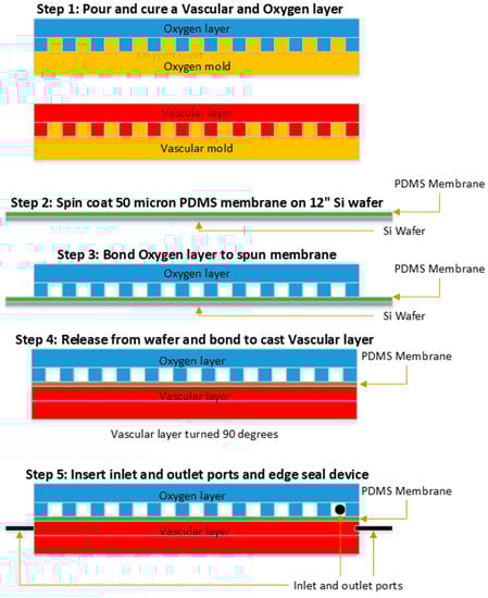 The fabrication process is illustrated in Figure 2. Following precision machining, Al molds were sputtered (KDF Sputterer, Rockleigh, NJ, USA) with a 500 Å layer of Au to promote the release of the casted PDMS layers from the mold surface. Vascular and oxygen layers of the device were made from NuSil (MED-6015, NuSil, Carpinteria, CA, USA), a two-part transparent silicone elastomer (PDMS) comprising an elastomer and a curing agent. The silicone elastomer and curing agent were mixed at a 10:1 ratio by weight using the SpeedMixer DAC 600.1 FVZ (FlackTek, Landrum, SC, USA). The NuSil was mixed at 1000 RPM for 15 s, followed by mixing at 2000 RPM for 1 min. A mass of 300 g of the mixed NuSil was poured onto the Al mold for the vascular layer, and 110 g was poured into the oxygen layer mold; poured molds were placed in a desiccator to degas for 45 min. Degassed layers were cured at 65 °C for a minimum of 3 h. Cured vascular and oxygen layers were removed from the molds and cut to size, with tabs to support the insertion of tubing in the final device once assembled. The final layer footprint was approximately 12 cm × 16 cm.