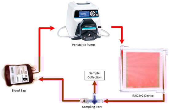 A circuit consisted of a blood reservoir, RAD2v2 oxygenator, 1/8″ inner diameter (ID) connective tubing, and a peristaltic pump (Masterflex Pump System, Cole Parmer; Vernon Hills, IL, USA) (Figure 4). Connective tubing leading into and out of the RAD2v2 oxygenators was 1/16″ ID. Additionally, control circuits (n = 3) consisting of blood reservoir, tubing connections, peristaltic pump, but no in-line oxygenators were assessed to differentiate the effects of the circuit components relative to the RAD2v2 oxygenator specifically. Two RAD2v2 oxygenators were tested simultaneously in separate circulation loops, or one oxygenator was tested alongside a control circuit. Circuits were primed with normal saline prior to the start of the blood circulation. Blood flow rate, standardized to 25 mL/min, was monitored using Transonic Systems (Ithaca, NY, USA) PXL Clamp-On flow sensors, and pressure was monitored using a TruWave pressure transducer (Edwards Lifesciences; Irvine, CA, USA). The number of pump revolutions per minute to maintain flow, as well as the heparin requirements to maintain target ACT, were recorded. Blood flow was set to 25 mL/min for hemocompatibility testing in order to evaluate blood at a flow rate relevant for oxygen transfer; as noted in the Results section, the RAD2v2 is projected to achieve roughly 3.3 volume percent oxygen transfer at this flow rate. Hourly blood samples were collected for blood gas assessment (GEM Premier 5000, Instrumentation Laboratories; Bedford, MA, USA) to ensure that blood pH, partial pressure of oxygen, and partial pressure of carbon dioxide all remained within physiological limits. At the start of circulation (baseline), and at 3 h and 6 h circulation time, complete blood count (CBC) was measured via hematology analyzer (ADVIA 2120, Siemens; Munich, Germany) and concentration of plasma free hemoglobin (fHb) was assessed via spectrophotometric methods [37]. Additionally, blood was collected for coagulation assessment using thromboelastography (TEG) with citrated kaolin test (TEG 5000, Haemonetics Corp.; Boston, MA, USA), platelet aggregometry (Chrono-Log Corp.; Havertown, PA, USA) with collagen (3.2 µg/mL; Helena Laboratories; Beaumont, TX, USA) for activation, and flow cytometry (Cytoflex, Beckman Coulter Life Sciences; Indianapolis, IN, USA) to evaluate platelet surface expression of P-selectin (CD62P, activated platelet marker) and phosphatidyl serine (PS, procoagulant surface marker). For flow cytometry analysis, as previously reported, 5 µL of EDTA anticoagulated whole blood was incubated for 20 min with monoclonal antibodies for CD61 (platelet glycoprotein IIIa) (Bio-Rad; Hercules, CA, USA), CD62-RPE (Bio-Rad; Hercules, CA, USA) and bovine lactadherin-FITC (Haematologic Technologies, Inc.; Essex Junction, VT, USA) at room temperature. Samples were then diluted using Hank’s buffered salt solution and analyzed immediately with gating of the platelet population (CD61 positive population) [38]. Results are expressed as a percentage of P-selectin positive and PS positive platelets. Statistical analysis was performed using SAS 9.4 (Cary, NC, USA). All tests were two-sided with alpha <0.05 for significance. A Shapiro–Wilk test was first conducted to assess the distribution of the data for normality. If skewed, the data were then transformed, or a nonparametric version of the test was used. Groups were independently tested using one-way mixed models with repeated measures and Dunnett adjustment, to evaluate changes over time from the start of circulation. Between-group differences were examined using a two-way mixed model with repeated measures and Tukey adjustment.