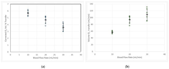 (a) Oxygen transfer rates versus blood flow rates for six RAD2v2 devices showing oxygen transfer (volume percent, defined as mL O2/min divided by blood flow rate (mL/min) corrected for hemoglobin and STP.) At each blood flow rate, each device was tested three times and the average recorded. The standard deviation reflects the variation between the six devices tested. Note that the volume percent at 30 mL/min blood flow corresponds to an increase in oxygen saturation from 75 to 95%. (b) Data from Figure 5a plotted as volume rate of oxygen transfer versus blood flow rate.