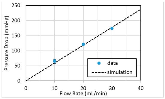 The pressure drop across the blood circuit was also monitored as described in the Methods section. The pressure drop included the device layer and the tubing connections. The pressure was recorded continuously during blood flow, and averages at each flow rate in four devices (shown in Figure 6) were compared with calculated values as described previously [23]. The experimental level of the pressure drop included the drop in the tubing, which was calculated at 25 mL/min to be 57 mm Hg. Note that the pressure drop measured at 25 mL/min blood flow, shown in Figure 6, averages approximately 150 mm Hg, and therefore if the contribution from the tubing lengths at the inlet and outlet of the device (57 mm Hg) is accounted for, then the actual device pressure drop is approximately 93 mm Hg. This level, while far lower than previous microfluidic oxygenators we have reported [23], is still somewhat elevated relative to optimal pressure drop in an ECMO circuit, and therefore future designs will aim to address this aspect.