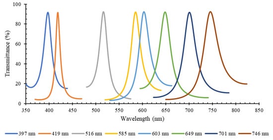 - Ferreira, D.S.; Mirkovic, J.; Wolffenbuttel, R.F.; Correia, J.H.; Feld, M.S.; Minas, G. Narrow-band pass filter array for integrated opto-electronic spectroscopy detectors to assess esophageal tissue. Biomed. Opt. Express 2011, 2, 1703. [Google Scholar] [CrossRef] [PubMed] [Green Version]