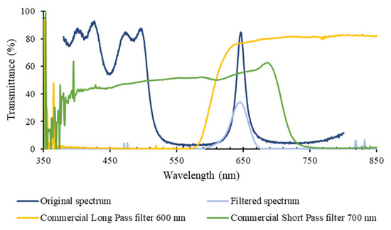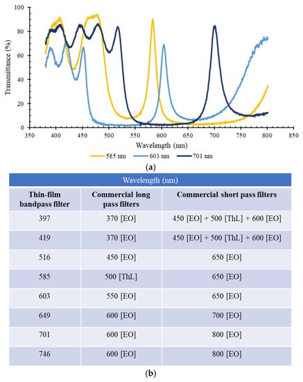- Pimenta, S.; Cardoso, S.; Miranda, A.; de Beule, P.; Castanheira, E.M.S.; Minas, G. Design and fabrication of SiO2/TiO2 and MgO/TiO2 based high selective optical filters for diffuse reflectance and fluorescence signals extraction. Biomed. Opt. Express 2015, 6, 3084. [Google Scholar] [CrossRef] [PubMed] [Green Version]
