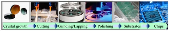 As one of the most promising third-generation semiconductor materials, single-crystal 4H–SiC is of great interest due to its excellent electrical, mechanical, and chemical properties, such as forbidden bandwidth, high breakdown electric field, high electron mobility, high breakdown strength, and high thermal conductivity. Furthermore, it is suitable for preparing electronic devices under extreme environmental conditions, such as high voltage, high frequency, high power, and high temperature [1,2]. To prepare electronic devices based on a 4H–SiC substrate, a damage-free, ultra-smooth atomic-level surface with a high surface flatness (total thickness variation (TTV); TTV ≤ 15 μm) and low surface roughness (Ra; must be maintained at values less than 0.3 and 0.5 nm for the C- and Si-faces, respectively) is required [3]. A single-crystal 4H–SiC for an electronic device’s preparation requires a series of processing processes, such as cutting, grinding/lapping, and polishing (as shown in Figure 1). The processing technology determines the surface quality of the SiC and directly affects the device’s preparation level and performance. However, due to its high hardness, high brittleness, and high stable chemical properties, the high-quality and high-efficiency surface grinding/lapping/polishing processing is challenging [4,5].