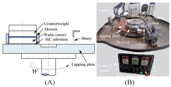 The principle (A) and device (B) for the lapping experiment of the SiC substrate.