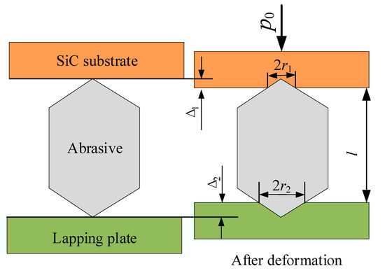 Hu et al. [20] established a contact model among an abrasive, an SiC substrate, and a lapping plate, as shown in Figure 4. According to the deformation amount at the contact area (Equation (2)), the material removal rate Vr of a single abrasive can be expressed as Equation (3), and if the abrasives are evenly distributed on the surface of the SiC substrate and the lapping plate, the material removal mathematical model of MRRm for the mass of the SiC can be expressed as Equation (4).
