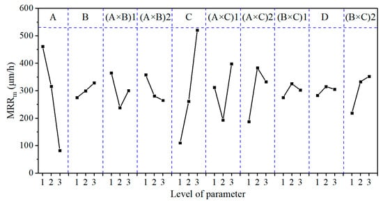 Figure 5, Figure 6 and Figure 7 show the effect curves of MRRm, Ra, and TTV with each process parameter, respectively. From these figures, it can be seen that different lapping plates (A) exhibited different processing performance levels. When using the cast iron plate (with a hardness of 175 HV), the MRRm, Ra, and TTV were the largest; when using the polyurethane pad (with a hardness of 35 HD), the MRRm and Ra were the smallest; when using the copper plate (with a hardness of 50 HV), the TTV was the smallest. It can also be seen that as the lapping normal-pressure (B) increased, MRRm continually increased, Ra continually decreased, and TTV first decreased and then increased. Additionally, when the abrasive size (C) increased, MRRm increased, Ra continually decreased, and TTV first decreased and then increased. Furthermore, the MRRm, Ra, and TTV increased and then decrease as the abrasive concentration (D) increased. It was also found that the three sets of binary interaction effects of (A × B), (A × C), and (B × C) showed significant differences in the effects on MRRm, Ra, and TTV. MRRm and Ra decreased and then increased with the interaction of (A × B), and TTV continually decreased; MRRm, Ra, and TTV continually increased with the interaction of (A × C); MRRm, Ra, and TTV increased and then decreased with the interaction of (B × C). Finally, the MRRm was the highest under the parameter condition of A1B3C3D2 (Exp. No. 9). When the lapping plate, lapping normal-pressure, abrasive size, and abrasive concentration were a cast-iron plate, 15 kg, 5 μm, and 2.0 wt.%, respectively, the processing efficiency was the highest. Under the parameter condition of A3B3C1D1, i.e., the lapping plate, lapping normal-pressure, abrasive size, and abrasive concentration were a polyurethane plate, 15 kg, 1 μm, and 0.5 wt.%, respectively, the Ra value was the smallest; that is, the best-machined substrate surface could be obtained. When the conditions of the A2B2C1D1, i.e., the abrasive plate, lapping normal-pressure, abrasive size, and abrasive concentration were a copper plate, 10 kg, 1 μm, and 0.5 wt.%, respectively, the TTV value was the smallest; that is, the substrate surface had the best flatness after lapping.