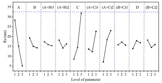 It can be seen from the RRa, FRa, and Ra contribution (%) values from Table 6 and Table 7 that the primary and secondary order of the effects of each process parameter on Ra was as follows: C > A > (A × C) > B > (B × C) > (A × B) > D; among them: the C, A, and (A × C) process parameters also had the most significant effects on Ra, with total contributions as high as 91.61% (35.44%, 32.53%, and 23.64%, respectively), which was similar to the effects on those of MRRm.