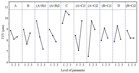 It can be seen in the RTTV, FTTV, and TTV contribution (%) values from Table 8 and Table 9 that the process parameters on TTV can be arranged in descending order as follows: (A × C) > (A × B)> (B × C) > B > C > A > D; among them: the (A × C), (A × B), (B × C), and B process parameters had the most significant effects on TTV, and their total contributions were as high as 88.59%. Furthermore, it is worth noting that the contribution of (A × C) alone to TTV was as high as 51.07%. This shows that in the lapping process of SiC, if we want to pursue a better TTV, we should pay special attention to the binary interaction effect between the lapping plate type and the abrasive size in order to reasonably select them.