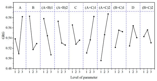 From the RGRG and FGRG values and the GRG contribution (%) shown in Table 12 and Table 13, it can be seen that the main order of each process parameter’s effect on GRG was (A × C) > (A × B) > A > B > (B × C) > C > D. The (A × C), (A × B), A, B, and (B × C) factors had the most significant effects on GRG, with contributions to GRG of 35.61%, 20.12%, 13.93%, 12.65%, and 7.70%, respectively. This conclusion differs from that of Section 3.1, mainly because Section 3.1 only considers each process parameter’s effect on the MRRm, Ra, and TTV individually rather than the comprehensive performance.