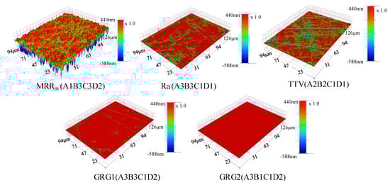The surface topographies of the optimal combination for MRRm (A1B3C3D2), Ra (A3B3C1D1), TTV (A2B2C1D1), GRG1 (A3B3C1D2), and GRG2 (A3B1C1D2).