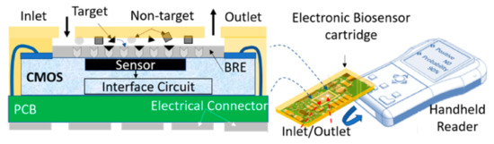Schematic view of fully integrated CMOS-based PoC system including an electronic disposable cartridge and a reader: CMOS biosensor features a CMOS sensor and circuit, BRE layer, and microfluidic with inlet/outlet.