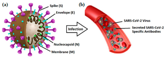 Schematic view of (a) SARS-CoV-2 virus and its structural proteins; (b) infection by SARS-CoV-2 and secretion of specific antibodies in the bloodstream.