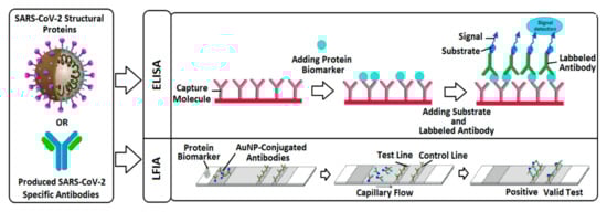 Protein-based tests are mostly based on enzyme-linked immunosorbent assay (ELISA) and lateral flow immunoassay (LFIA) cassettes, as seen in Figure 3. ELISA is a routine laboratory-based method for antibody testing by using specific enzymes and specific capture antigens for SARS-CoV-2 biomarkers [37] while LFIAs implement anti-human antibodies immobilized on a nitrocellulose membrane to sense the presence of the targeted specific SARS-CoV-2 antibodies using label and anti-human conjugates. Specimens such as nasal and nasopharyngeal swabs are collected by inserting and rolling the swab in the nose or nasopharynx, respectively. Next, the swab including the sample is either directly processed or immediately placed in a sterile tube containing a transport medium for further analysis [38]. LFIA strips separate the biomarkers in the sample using a chromatographic system and capillary flow and detects them based on specific interactions between the capture molecule and the virus protein biomarker. The colloidal gold nanoparticles (AuNPs) are employed in this technology as reporters to visually detect the biomarker in the solution [39].