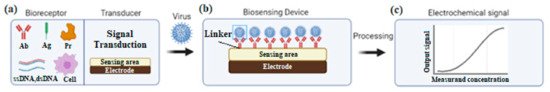 Schematic view of an electrochemical biosensor: (a) The surface of these biosensors can be functionalized with various receptors; (b) when spotted on the sensing area, these BREs capture the specific targets such as viral particles; and (c) the electrochemical signal is reported after the processing steps. Ag: Antigen, Ab: Antibody, Pr: Protein.