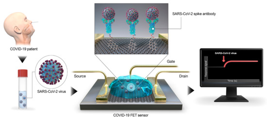 Antibodies have been widely used as receptors for disease detection purposes including respiratory diseases. After the coronavirus spread, researchers have made several attempts to adapt these biosensors for COVID-19 diagnostics [57]. Seo et al. have reported one of the very promising graphene field-effect transistor (G-FET)-based biosensing devices for SARS-CoV-2 detection (Figure 5) [59]. Firstly, Poly (methyl methacrylate) (PMMA) C4 was spin-coated onto graphene sheets to produce PMMA/graphene. Subsequently, the PMMA/graphene layer was added on top of the SiO2/Si substrate of the FET sensor. To functionalize the surface, the fabricated graphene-based sensor was modified with PBASE and the graphene sheet was conjugated with the SARS-CoV-2 anti-S-specific antibodies. This portable, sensitive, and rapid FET sensor was capable of detecting SARS-CoV-2 with no cross-reaction with other respiratory viruses such as MERS-CoV and SARS-CoV, and the procedure did not require any sample preparation, pretreatment, or labelling complex steps. On the other hand, Zhang and colleagues developed another rapid G-FET immunosensor that could detect positive COVID-19 cases in about 2 min [68]. The surface of this biosensor was modified with antibody against SARS-CoV-2 S protein (S1 subunit) (CSAb) to capture the virus S protein antigen. The results demonstrated that the CSAb-modified G-FET devices detect the SARS-CoV-2 virus with higher sensitivity compared with the antigen-coated biosensor. In another attempt, they used a combination of ACE2 receptors (negatively charged) and CSAb (positively charged) to increase the sensitivity of the device. For this aim, they first synthesized single crystal graphene on single crystal Cu to form the G-FET. Afterward, they functionalized the surface area with either ACE2 receptor or CSAb as the BRE. By adding the COVID-19 positive samples, the S1 protein (positively charged) was attached to the graphene-surface immobilized CSAb/ACE2 receptors. This antibody–antigen reaction resulted in an alteration in conductance/resistance, which will be subsequently read out electrically.