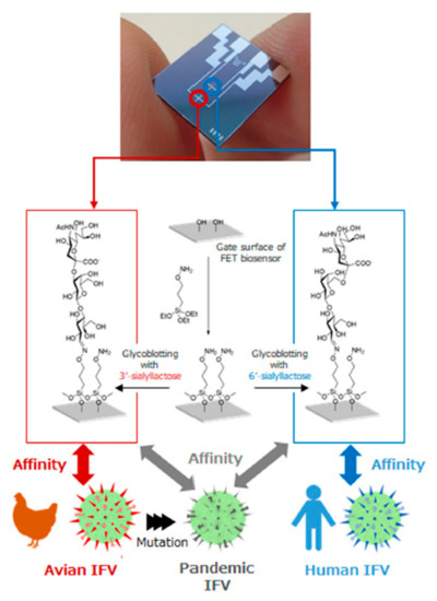 FET-based immunosensors have also been used for the detection of other respiratory infections previously. As an illustration, a label-free FET-based device was developed for the electrical detection of SARS-CoV N protein using antibody mimics as receptors [73]. The Si/SiO2 surface of the device was spotted with fibronectin probes and subsequently submerged in 6-phosphonohexanoic acid to attach the phosphonic acid residues to the surface. Subsequently, the functional groups of carboxylic acid were activated by adding EDC and the fibronectin probes were bound to the surface. This biosensor was able to detect 100 nM of the viral N proteins in the sample. Dual-channel FET-based immunosensors have also been fabricated for Influenza A virus detection. Hideshima et al. developed a glycan-immobilized sensing system that could directly target human Influenza A viral particles in the biological fluids [75]. In this study, they proposed a different functionalizing strategy, immobilizing host cell surface-mimetic glycan on the sensing surface. For this aim, the surface area was modified with sialic acid-α2,6-galactose and sialic acid-α2,3-galactose separately. Surface glycoproteins of the viruses recognize these sialic acid-terminated glycans and get caught by them after adding the positive sample to the immunosensor (Figure 6).