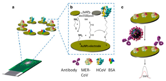 (a) An immunosensor for MERS-CoV detection; (b) fabrication of the biosensor and its surface functionalization; (c) virus detection process [79].