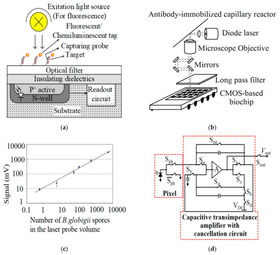 (a) CMOS-based optical sensor; (b) The diagram of the biochip proposed by Song et al.; (c) Detection of B. globigii in an antibody-immobilized capillary reactor utilizing the system shown in (b) [35]; (d) Schematic of the pixel and processing architecture of the LFIA reader proposed by Pilavaki et al.