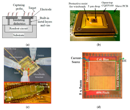 Electrochemical techniques offer real-time and label-free measurement detection, and the simplicity and scalability of these sensors help to adapt them to integrated equipment. The interfacing of other electrochemical biosensors including impedimetric, capacitive, amperometric, voltammetric, potentiometric, and the like can be shown in a general schematic, such as Figure 9a, in which the required sensing electrodes can be easily formed on the top metal layer of CMOS technology and also downscaled to develop a multi-targeting array of electrodes [82].