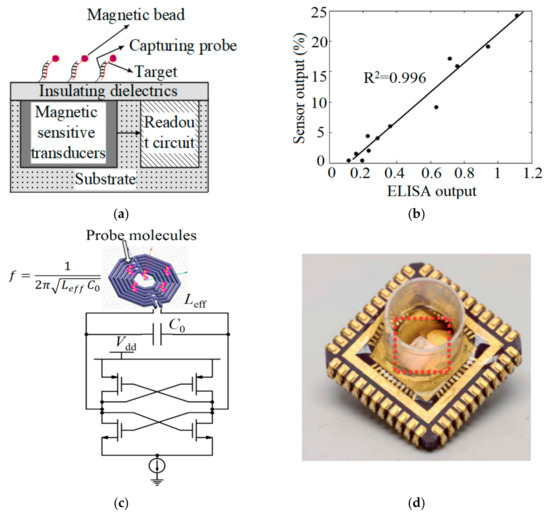 Magnetism originating from the target of interest labelled with magnetic particles can be detected from the samples which are free of magnetic background. In these sensors, as seen in Figure 10a, samples and transducers are not in direct contact because the magnetic field can penetrate the insulating layers. As a result, the hardware preparation of the CMOS chip should be simplified before the assay [82].