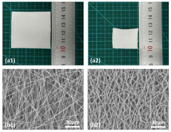 (a) Typical sample (applied voltage: 10 kV; solution concentration: 15%; distance between electrodes: 10 cm; speed of collector: 700 rpm/min; solution flow rate: 1.2 mL/h) before (a1) and after (a2) ethanol wetting. (b) SEM images before (b1) and after (b2) wetting.