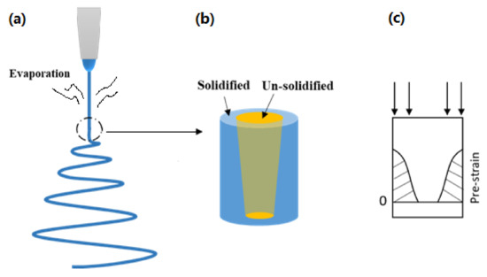 The evaporation of the solvent is inhomogeneous in the radial direction of the jet/fiber [29,30]. As an example, Figure 3a,b reveal that the solidification/drying of the jet starts from the surface of the jet (shell) and gradually moves into the core. The solidified shell (only partially solidified) is stretched in an elastic–plastic manner, while the inner unsolidified core is able to flow easily, which results in a pre-strain in the shell, as illustrated in Figure 3c. Since the solidification/drying process may continue toward the inner core even after the fiber has been collected on the roller collector, while a tensile force is applied, a gradient pre-strain field results in the fibers of the final dry membrane. This is a kind of programming, which stores the elastic energy for later on shape recovery [18,31]. However, since the pre-strain is in a gradient manner within the cross-section, during the ethanol wetting-induced shape recovery process, in which wetting starts from the outer-surface toward the inner part gradually, the pre-strained shell contracts (Figure 3c), while the inner core mostly maintains its shape. The result is buckling/crimping of the fiber, as reported in [25]. If the fiber is about uniformly pre-stretched, buckling may occur, in particular during chemically induced shape recovery [32], but the final shape of the fiber should be more or less straight.