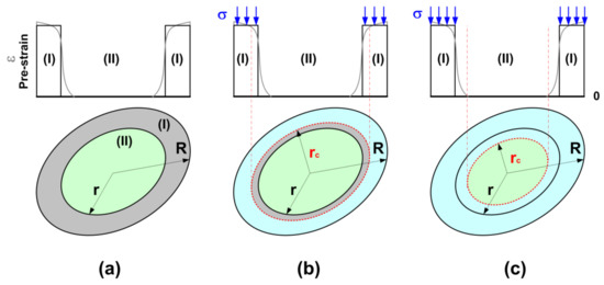 In the other case of (r ≥ rc) (Figure 4c), the compressive force in the pre-strained shell, i.e.