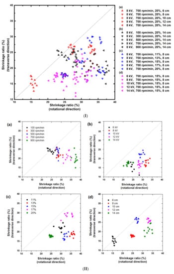 Shrinkage ratio along the rotational direction versus shrinkage ratio along the transverse direction (solution flow rate: 1.2 mL/h). (I) Overlapping of all experimental results; (II) results of parametric study. (a) Rotation speed of collector; (b) applied voltage; (c) solvent concentration; (d) distance between electrodes.