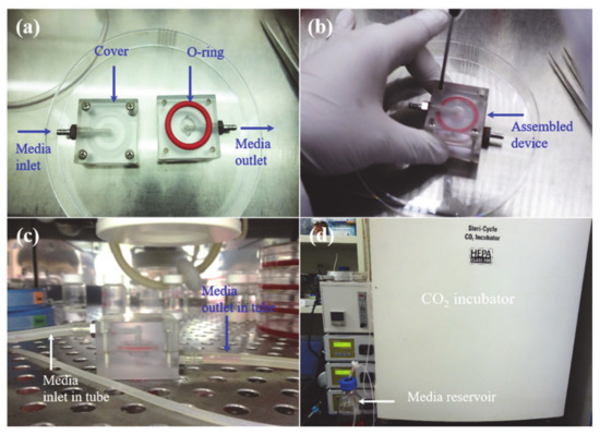 The fabricated system was composed of a mini chamber device (40 × 40 × 30 mm3) with inlets and outlets for the transport of media. A precision flowmeter was applied to the photographs of the developed system Figure 1a–d. The culture media was passed through a Tygon R3603 tube whose inner and outer diameters were 1.59 and 3.20 mm, respectively. A peristaltic pump (400 low-flow pump; Watson-Marlow Bredel Pump, Republic of Korea) was used to flow the cultured media. The fluid flow rate was adjusted to 0.035, 0.21, and 0.35 mL/min to achieve the shear stress of 1.018 × 10−6, 6.018 × 10−6, and 1.018 × 10−5 Pa, respectively. Static conditions were considered as the controls. The advantages of using the Tygon R3603 tube include its autoclavable and gas-permeable potential. An autoclave steam sterilizer was also used to sterilize the system (DAIHAN-Sci., Wonju, Republic of Korea). The rubber band (O-ring) and others were sterilized with 70% ethanol, followed by treatment with ultraviolet (UV) light. Different components of the developed system were assembled in a cell culture hood to avoid contamination.