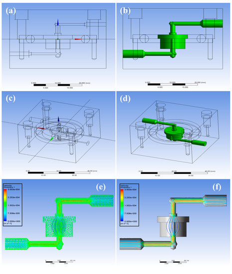 Computer-Aided Design (CAD) design of the developed device: (a,b) side drawing views (c,d) top drawing views with covers and (e,f) velocity magnitude (m/s) and streamlines for the media flow.