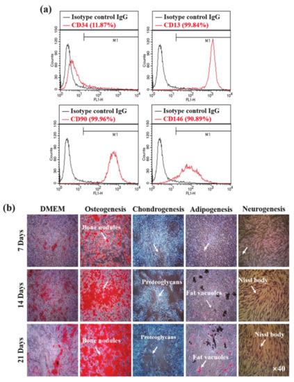 Sodium phosphate, paraformaldehyde, alizarin red S (ARS), alcian blue, oil red O dye, Nissl stain (all purchased from Sigma-Aldrich, Burlington, MA, USA), bovine serum albumin (BSA) (ICN Biomedicals, Aurora, OH, USA), antibodies (BD Biosciences, San Jose, CA, USA), osteogenic, chondrogenic, adipogenic, and neurogenic differentiation media (Gibco BRL), water-soluble tetrazolium salt 1 (WST-1) assay (EZ-Cytox Cell Viability Assay Kit, Daeillab Service Co., LTD., Cheongwon-gun, Korea), ALP kit (AnaApec, Fremont, CA, USA), TRIzol reagent (Thermo Fischer Scientific, Waltham, MA, USA), reverse transcriptase (Superscript II RTase, Invitrogen, Gaithersburg, MD, USA), and SYBR Green Master Mix (Bio-Rad, Hercule, CA, USA) were used as received from the supplier without further purification.