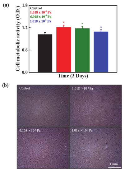 The morphologies of the cultured cells were examined using a light microscope, and the morphologies are shown in Figure 4b. The cultured cells were adequately attached to the substrate and elongated in shape. The cells were healthy and covered the entire culture surface. The cell densities were higher under shear stress conditions compared to the static condition, and this was higher in the 1.018 × 10−6 Pa condition than in the others, indicating a suitable condition for cell growth, as observed in the cell viability results.