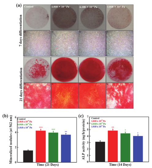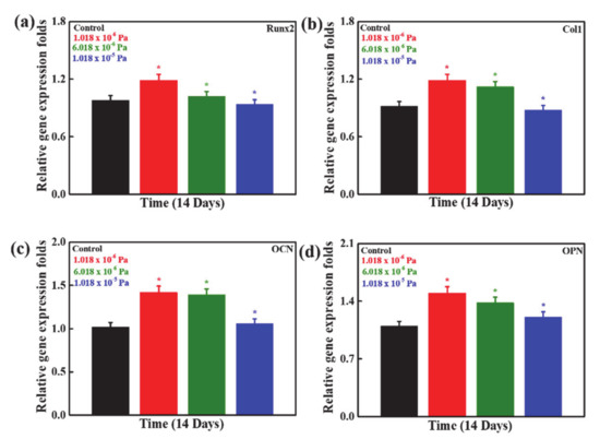 The ALP activity of cultured hMSCs was also measured under different shear conditions after 14 d of incubation, and the results are presented in Figure 5c. The groups without any shear stress were considered as the control (static). ALP activity also provides useful information on osteogenesis. ALP activity was prominently upregulated in shear stress-mediated groups compared to the control, showing positive effects of shear stress on osteogenesis of hMSCs. This was more up-regulated in the 1.018 × 10−6 Pa stress-treated groups than in the other groups. ALP is an ectoenzyme that triggers mineralization by involving the degradation of inorganic pyrophosphates. These degraded inorganic phosphates act as templates for mineralization [34].