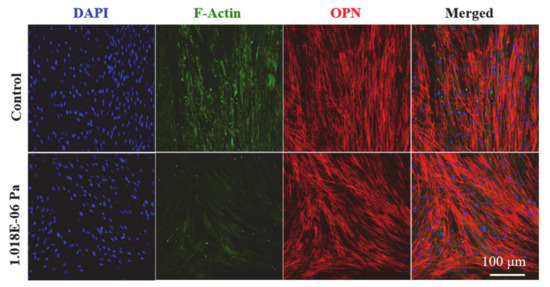 The morphologies of hMSCs cultured in the developed systems as determined by confocal laser scanning microscopy are presented in Figure 7. Here, we chose the 1.018 × 10−6 Pa shear stress to express OPN marker due to the improved osteogenic differentiation under these conditions. The groups without any stress were used as controls. Shear stress-treated cells exhibited higher expression levels of OPN gene marker compared to the control. Moreover, the cells were properly aligned and adhered to the surfaces. The limitation of our study is that the approach of mechano-transduction in hMSCs used in this study was not explored under different shear stress conditions. However, we demonstrated that shear stress plays important roles in the proliferation and differentiation of cells. We believe that the nutrients and surrounding ECM changes might be crucial factors that affect the shear stress in cultured cells.