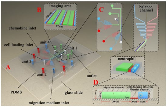 Schematic diagram of the F4-Chip used for cell chemotaxis research. (A) The isometric view of F4-Chip. (B) Enlarged view of the imaging area. (C) Enlarged view of unit 3 and unit 4. Each unit has its specific cell loading inlet, reagent inlet, and outlet. In addition, each unit has a balance channel to balance the pressure between the chemokine inlet and migration medium inlet. (D) The enlarged cell docking structure.