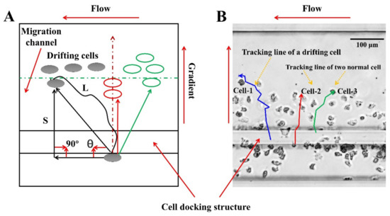 Cell migration analysis method. (A) Schematic diagram of the trajectory of drifting cells and normal cells. If θ is less than 90 degrees, the cells are migrating along with the flow. If θ is greater than 90 degrees, the cell migration progress is less affected by the flow. (B) The real trajectory of the drifting cells and normal cells in the cell migration channel.