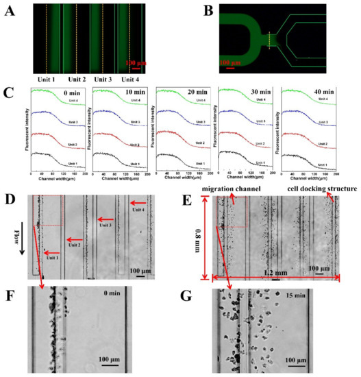 F4-chip characterization. (A) Fluorescent images in the four main channels; (B) Fluorescence image of the balance channel; (C) Gradient curves in unit 1, 2, 3, and 4 at 0 min, 10 min, 20 min, 30 min, 40 min; (D) Images of cell distribution beside cell docking structure; (E) Images of cell distribution in the migration channel after gradient application. Neutrophils need to deform and squeeze through the cell docking structure before migration into the migration channels; (F) An enlarged image for tracking analysis (0 min); (G) An enlarged image for tracking analysis (15 min).